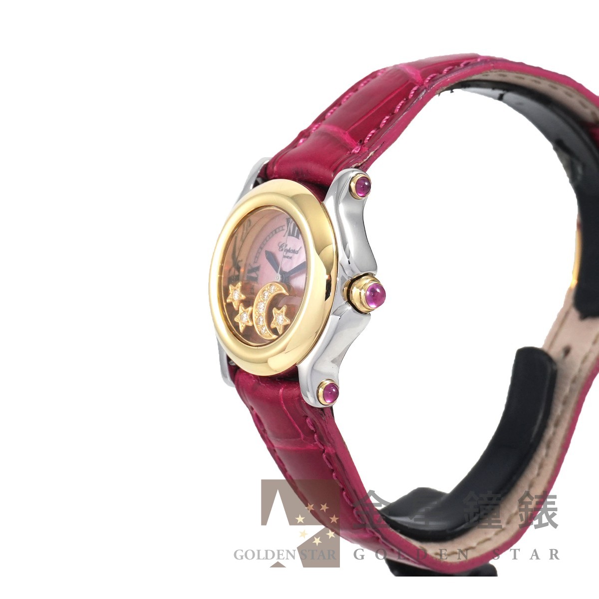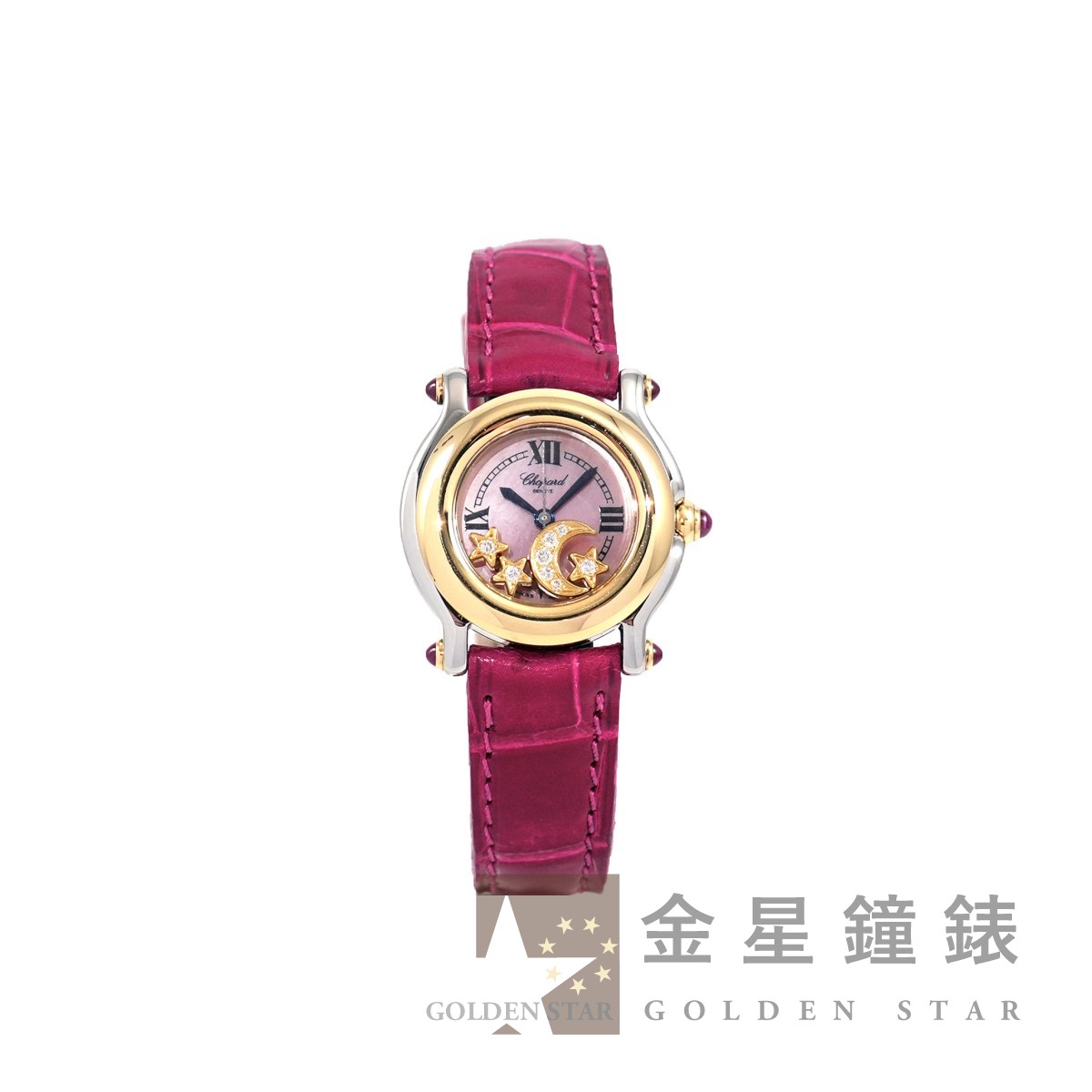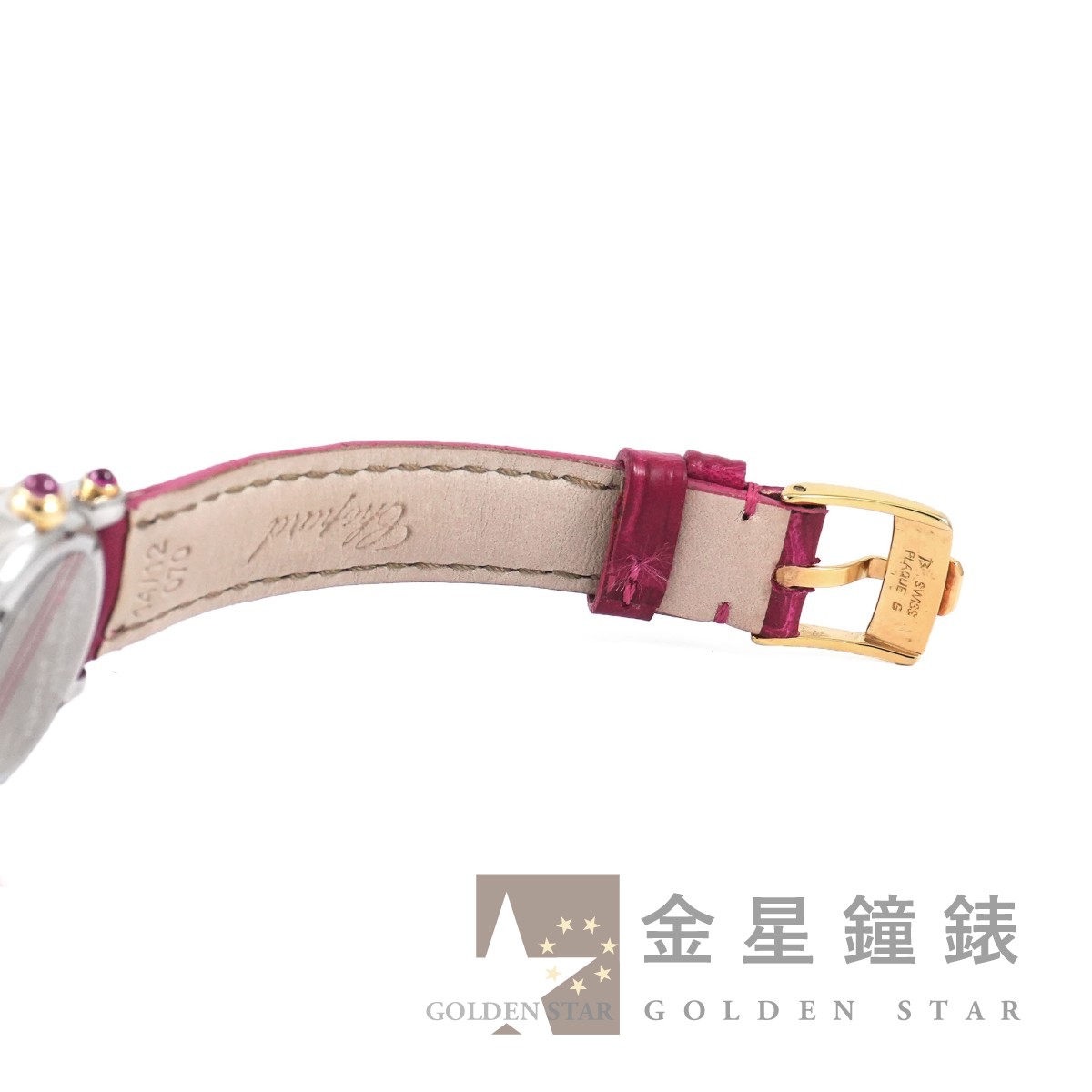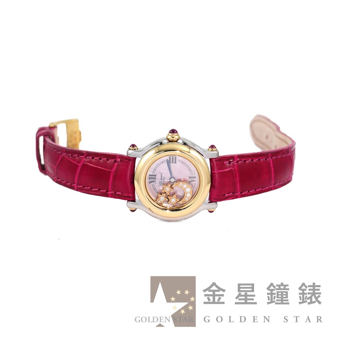 錶盤內皆為原廠鑽石,錶盤活動式跑動月亮鑲嵌共 5 顆鑽石約 0.7 ct ;錶盤 3 顆活動式跑動星星各鑲嵌 1 顆鑽石約 0.3 ct ;錶冠、錶耳共鑲嵌 5 顆粉紅色藍寶石,共約 0.6 ct / 高精準石英機芯 / 18K黃金亮面磨光錶圈 / 藍鋼劍形指針 / 軌道式時標 / 防水約30米