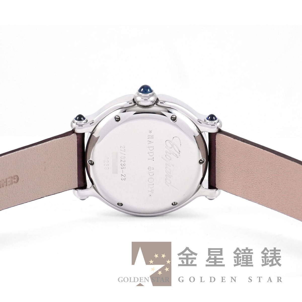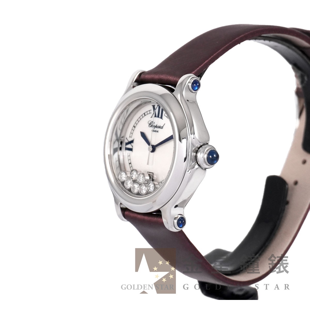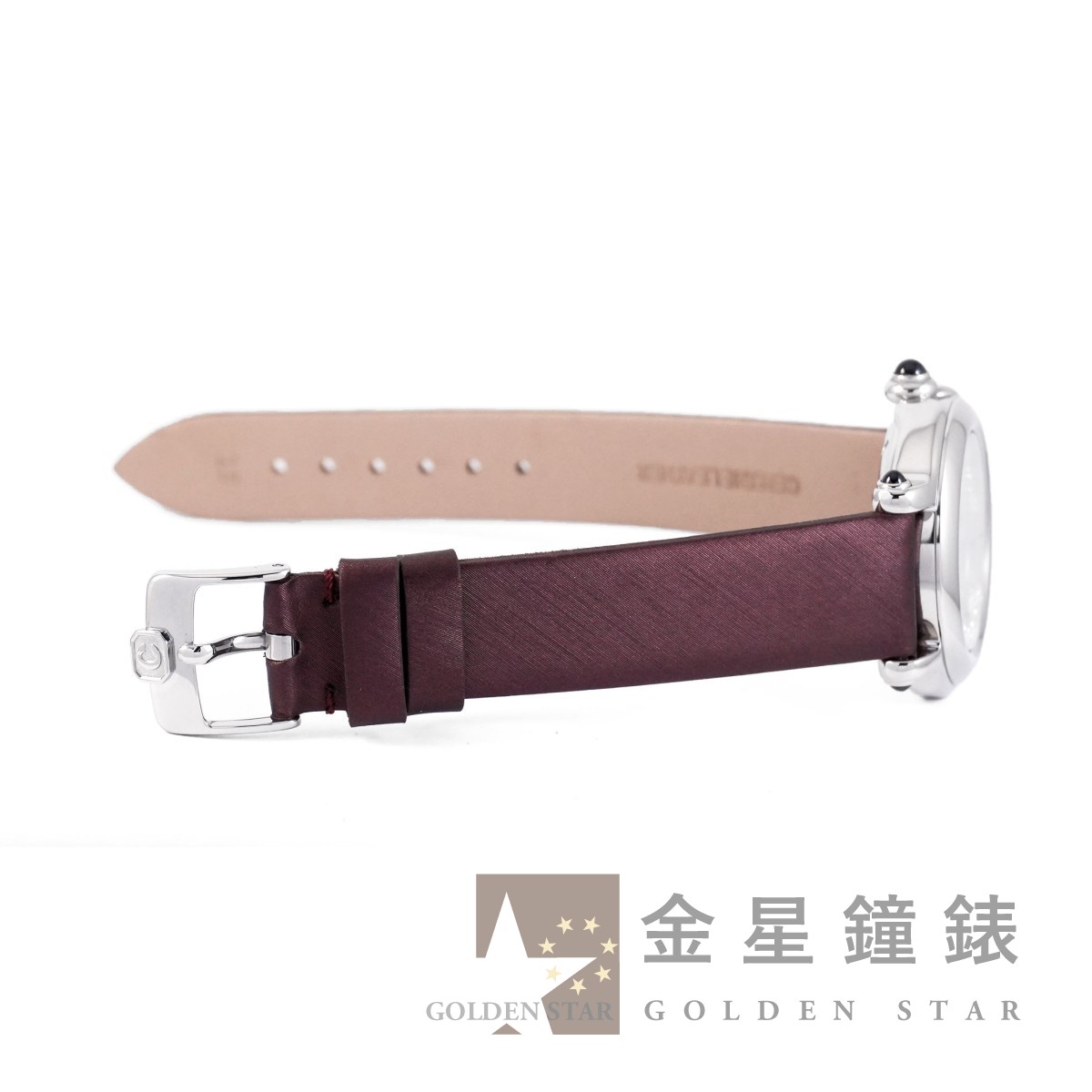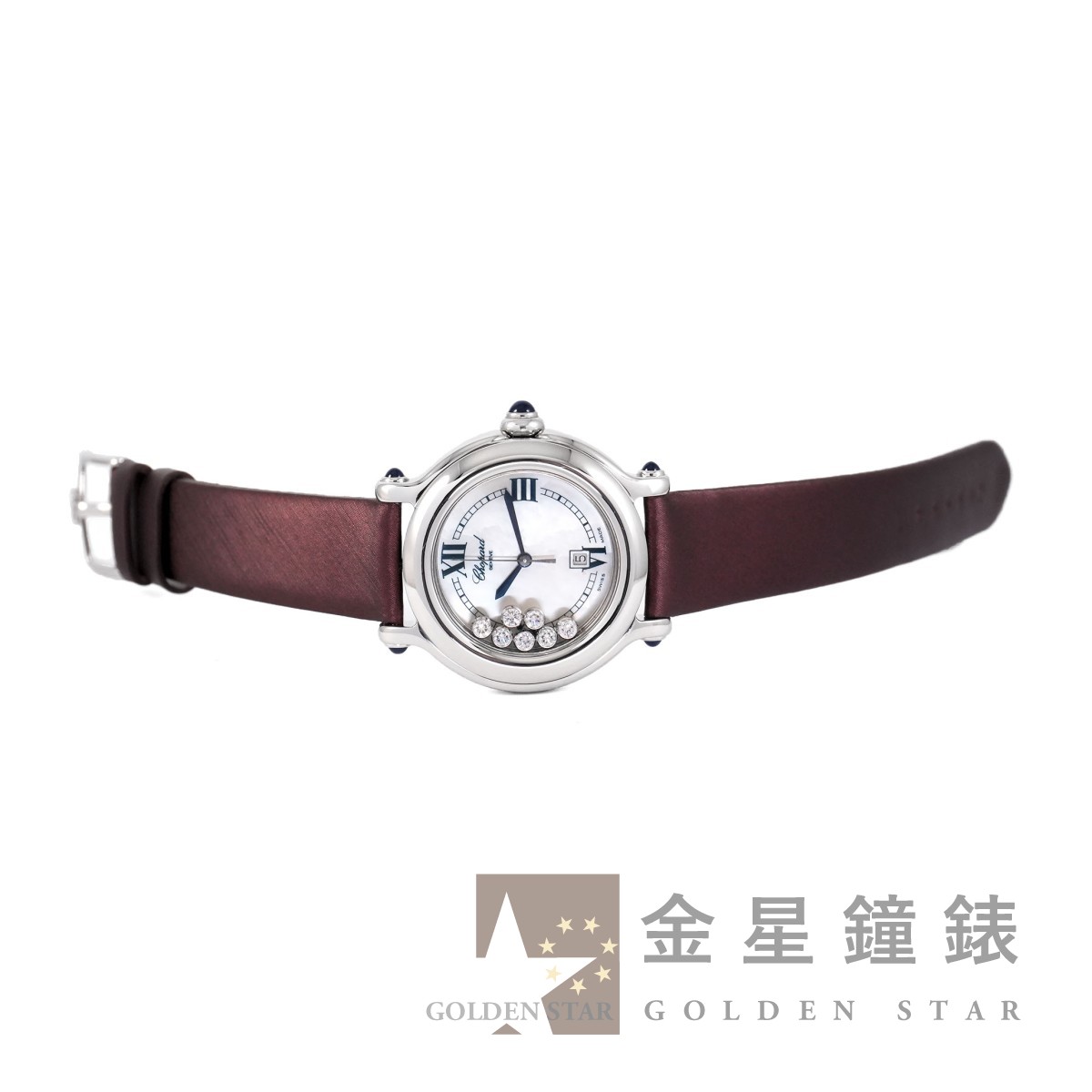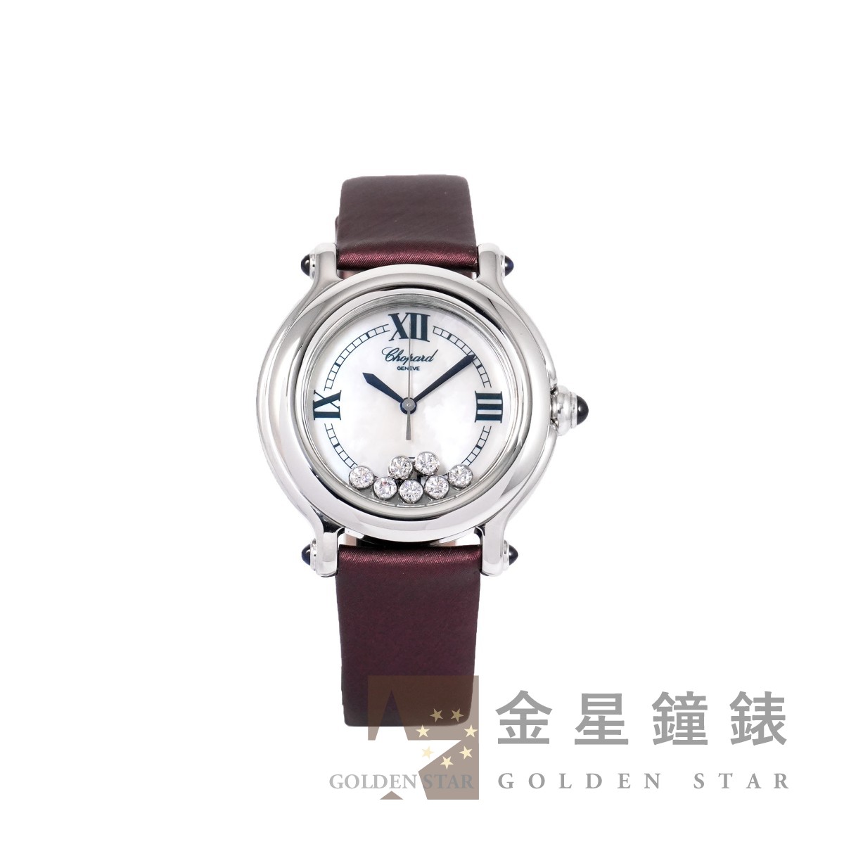錶盤內皆為原廠鑽石,錶盤 7 顆活動式跑鑽共約 0.39 ct ;錶冠、錶耳共鑲嵌 5 顆藍寶石,共約 0.73 ct / 高精準石英機芯 / 亮面磨光錶圈 / 藍鋼劍形指針 / 軌道式時標 / 防水約30米