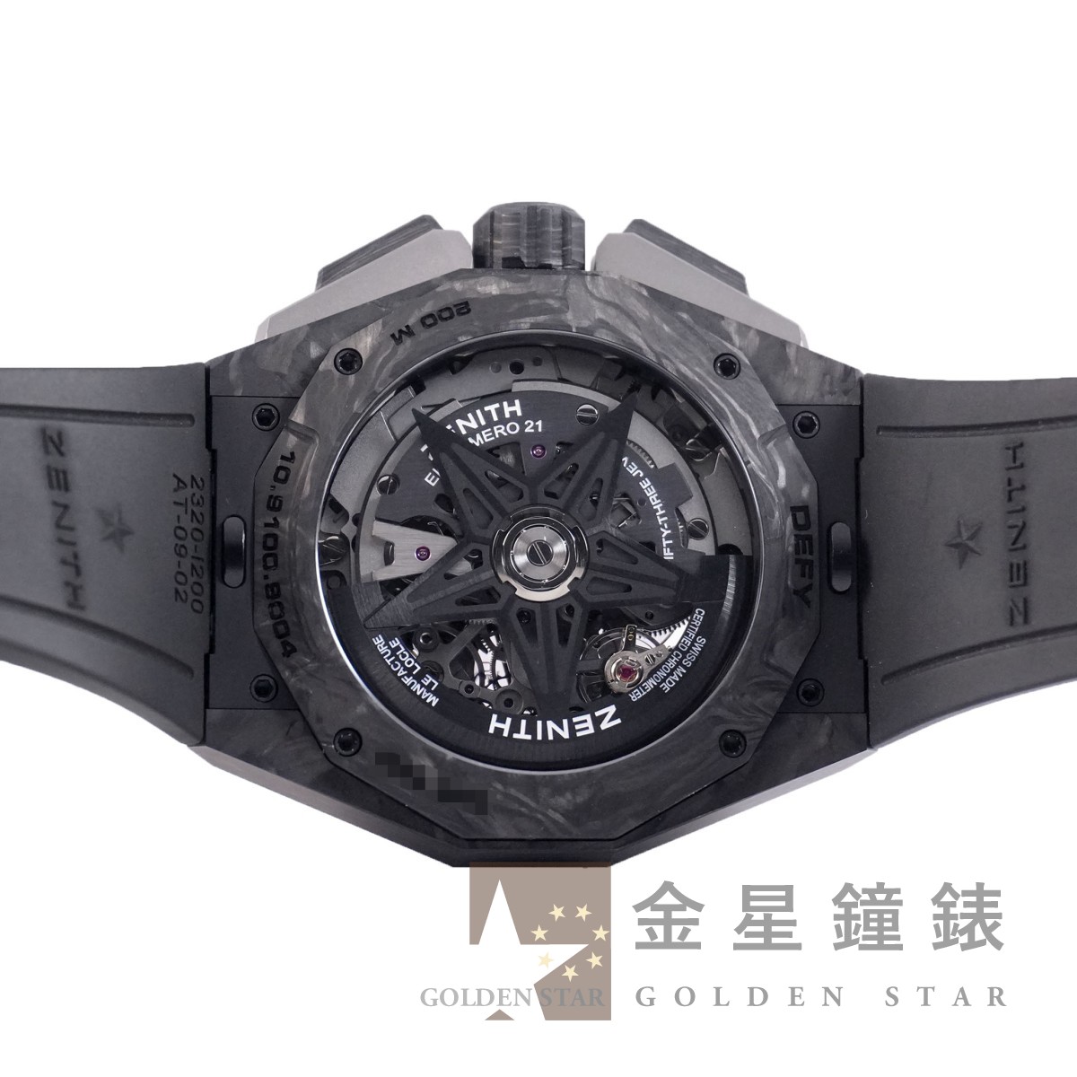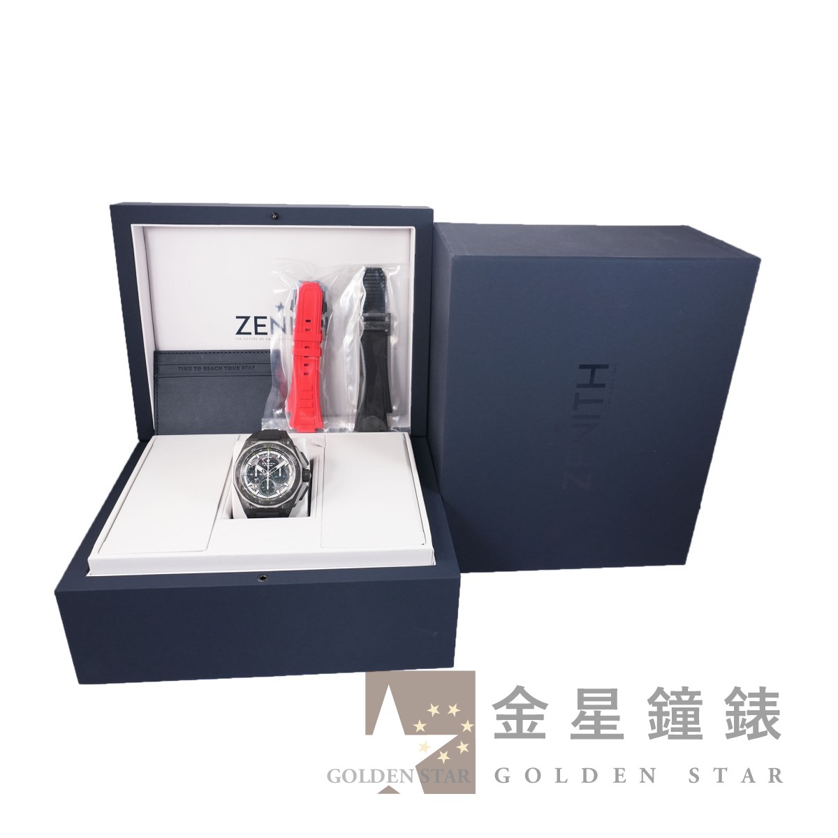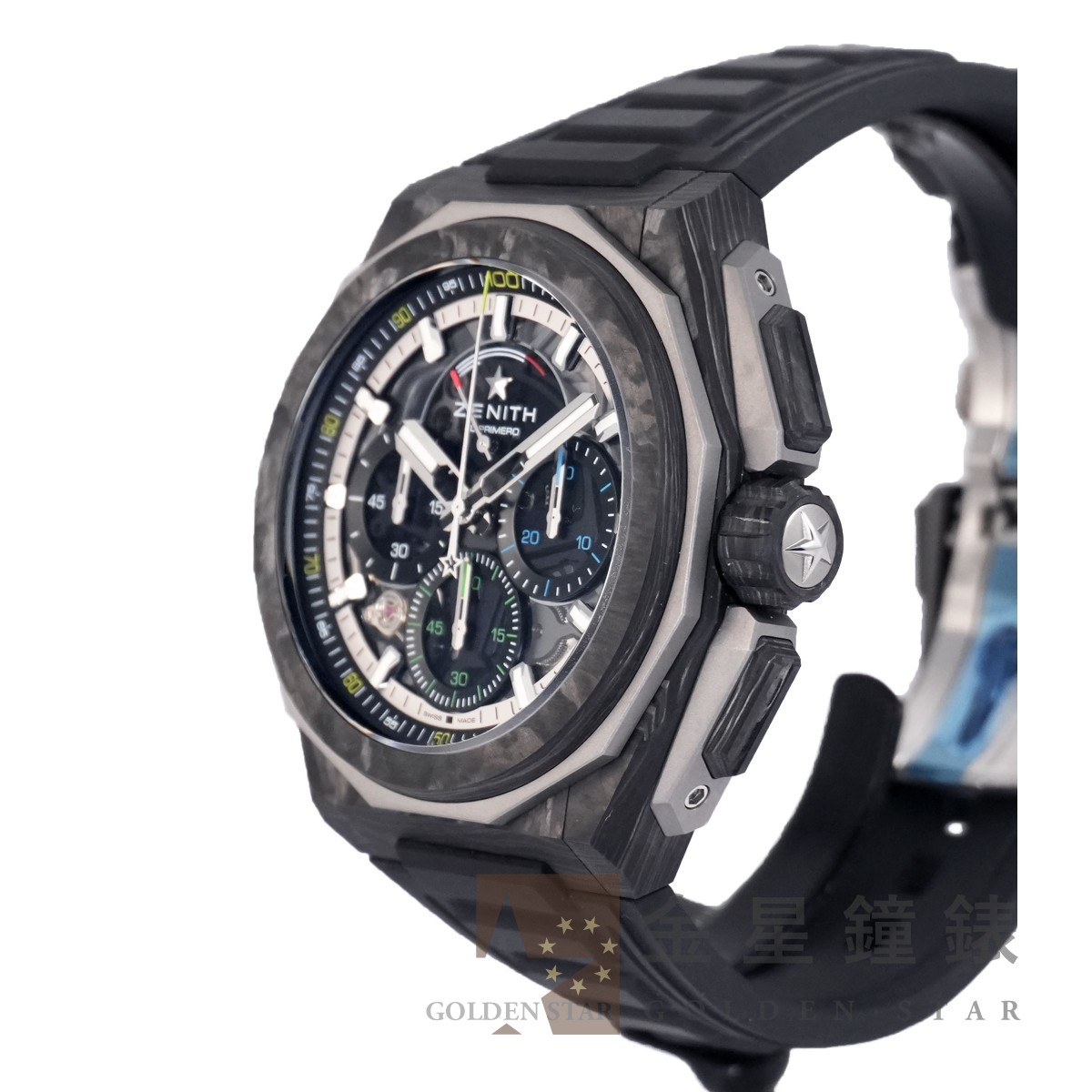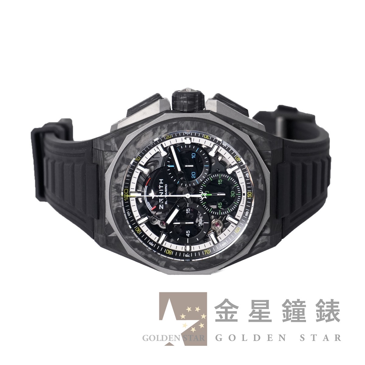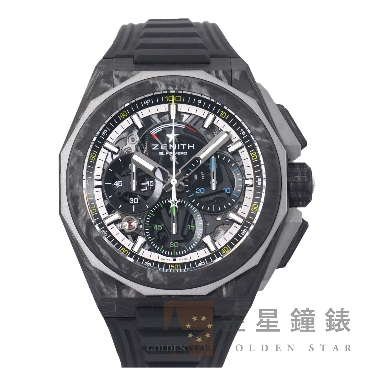 El Primero 9004 自動上鍊機芯,動力儲存約50小時,具 C.O.S.C 瑞士官方天文台認證,1/10秒精準計時功能,雙發條與雙輪系的架構,振頻 36000 vph ,計時輪系振頻 360,000 vph ,五角星造型鏤空自動舵 / 鈦金屬材質十二邊形錶框 / 錶盤 12 點鐘具有儀表板式動力儲存顯示 / 錶帶具有快拆系統 / 指針、刻度皆覆有夜光塗料 / 防水200米